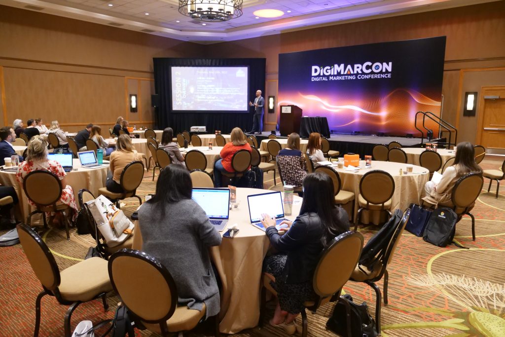 At DigiMarCon Conferences you are never ‘left in the dark’…. literally, in a large room far away from the stage and speakers, crushed in tight theater seating, without even a table, while sitting in the dark. At DigiMarCon all delegates have premium meeting space in luxurious ballroom well-lit spaces, with comfortable seating with table enabling delegates to use their laptop to take notes with ample charging facilities onsite in a comfortable space to learn and thrive. All tables are situated close with direct view of the stage.